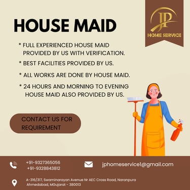 Welcome to JP HOME SERVICES, your trusted partner in home services. With a passion for excellence and a commitment to quality, we provide a wide range of services designed to make your home a better place. Whether you need assistance with Home Maid, Child Care, Patient Care, Driver, Deep Cleaning, Servant, Elderly Care, House Keeping, Cook. our team of skilled professionals is here to help.
